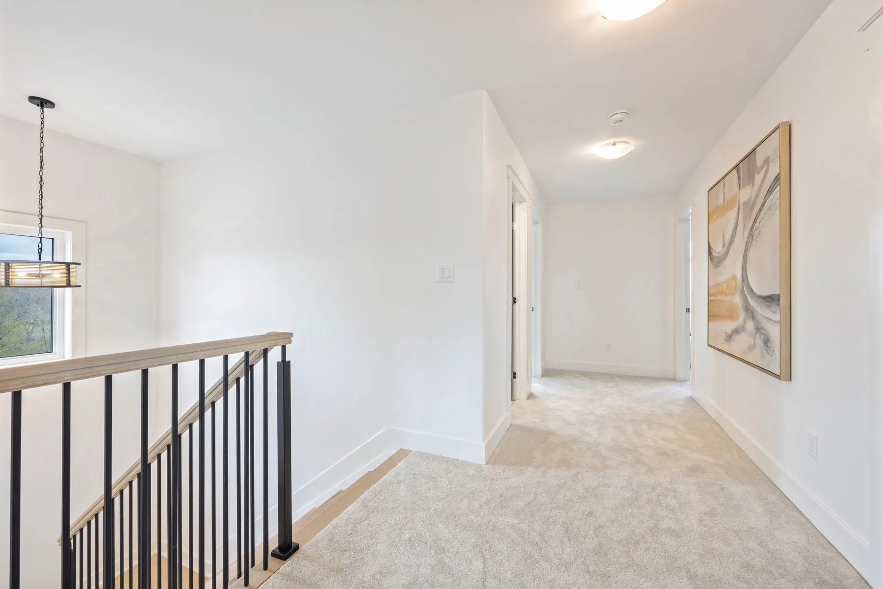- -White Oak stairs & handrail with black metal spindles, custom stain to compliment hardwood floors.